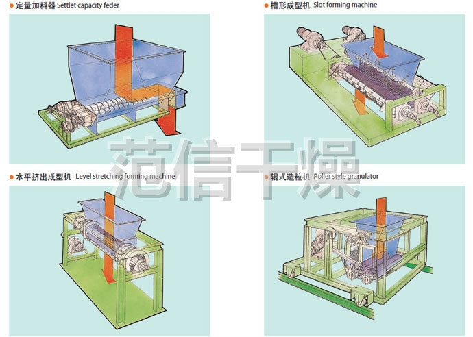 产品介绍 ◎槽形成型机: 由加料斗和刻有槽的二根辊子构成。以增大物料表面积的造粒为目的。物料被内侧运转的辊子吸入,被反转的外侧刮刀切成粒状。 ◎水平挤出成型机: 由加料斗、二根辊子和U形振动网构成。以增大物料的表面积为目的,造粒物料与振动网接触,由旋转辊子的强制压力挤出网外,形成圆柱形的颗粒。 ◎辊式造粒机: 由加料斗、二根辊子和振动网构成。以增大物料面积为目的的制粒机。物料与振动网接触,通过辊子左右往返运动强制将物料挤入网中,形成圆状形的颗粒。